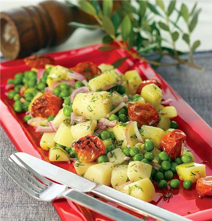 Warm Potato Meze with Peas, Roasted Tomatoes and Dill